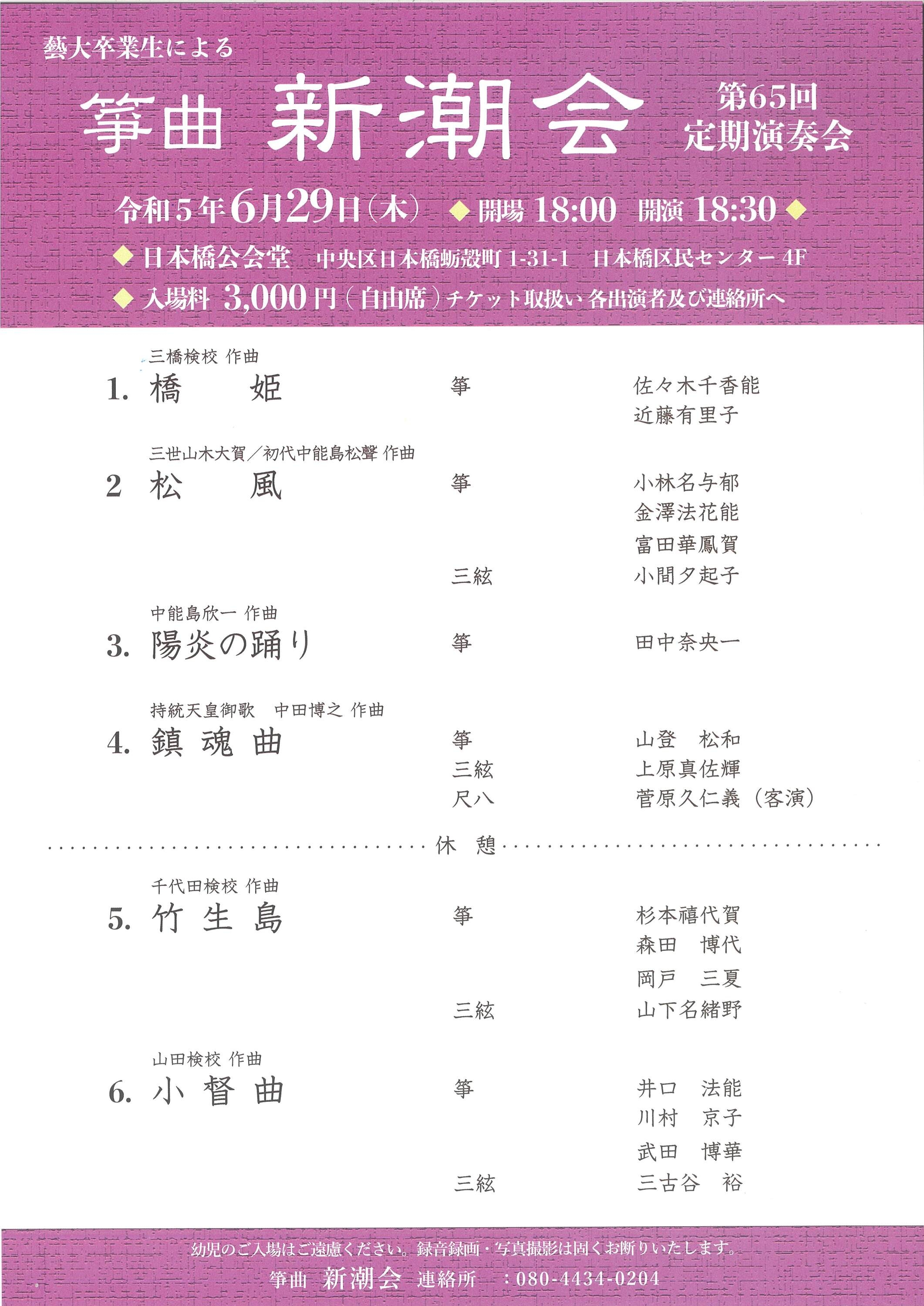 藝大卒業生による 箏曲 新潮会 第65回 定期演奏会 1. 橋姫 2. 松風 3. 陽炎の踊り 4. 鎮魂曲 休憩 5. 竹生島 6. 小督曲 |