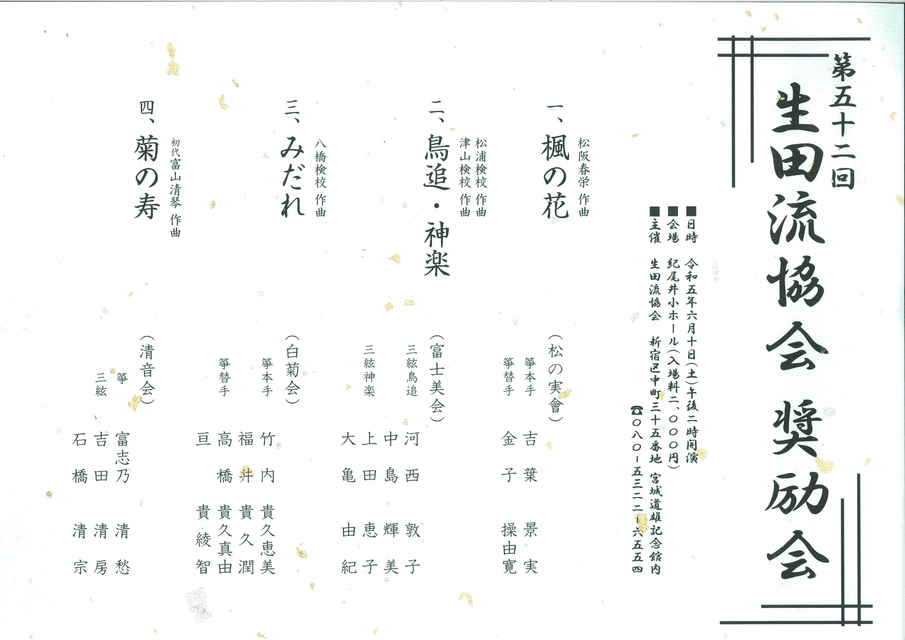 第52回生田流協会奨励会 1.楓の花 2.鳥追・神楽 3.みだれ 4.菊の寿 |