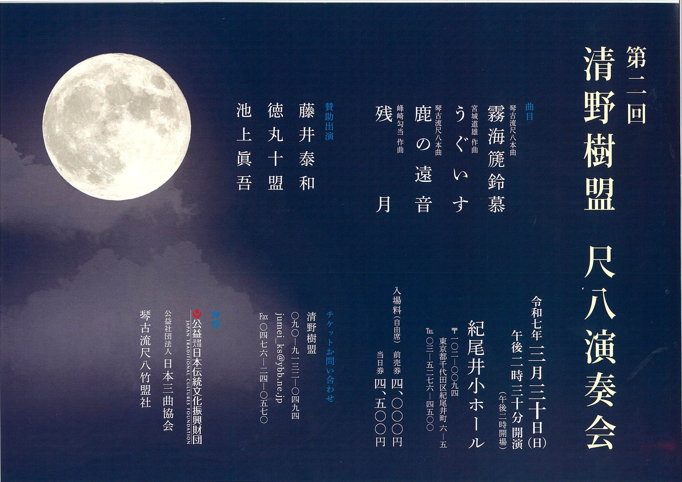 | 後援 | 公益社団法人 日本三曲協会 / 公益財団法人 日本伝統文化振興財団 / 琴古流尺八竹盟社 |