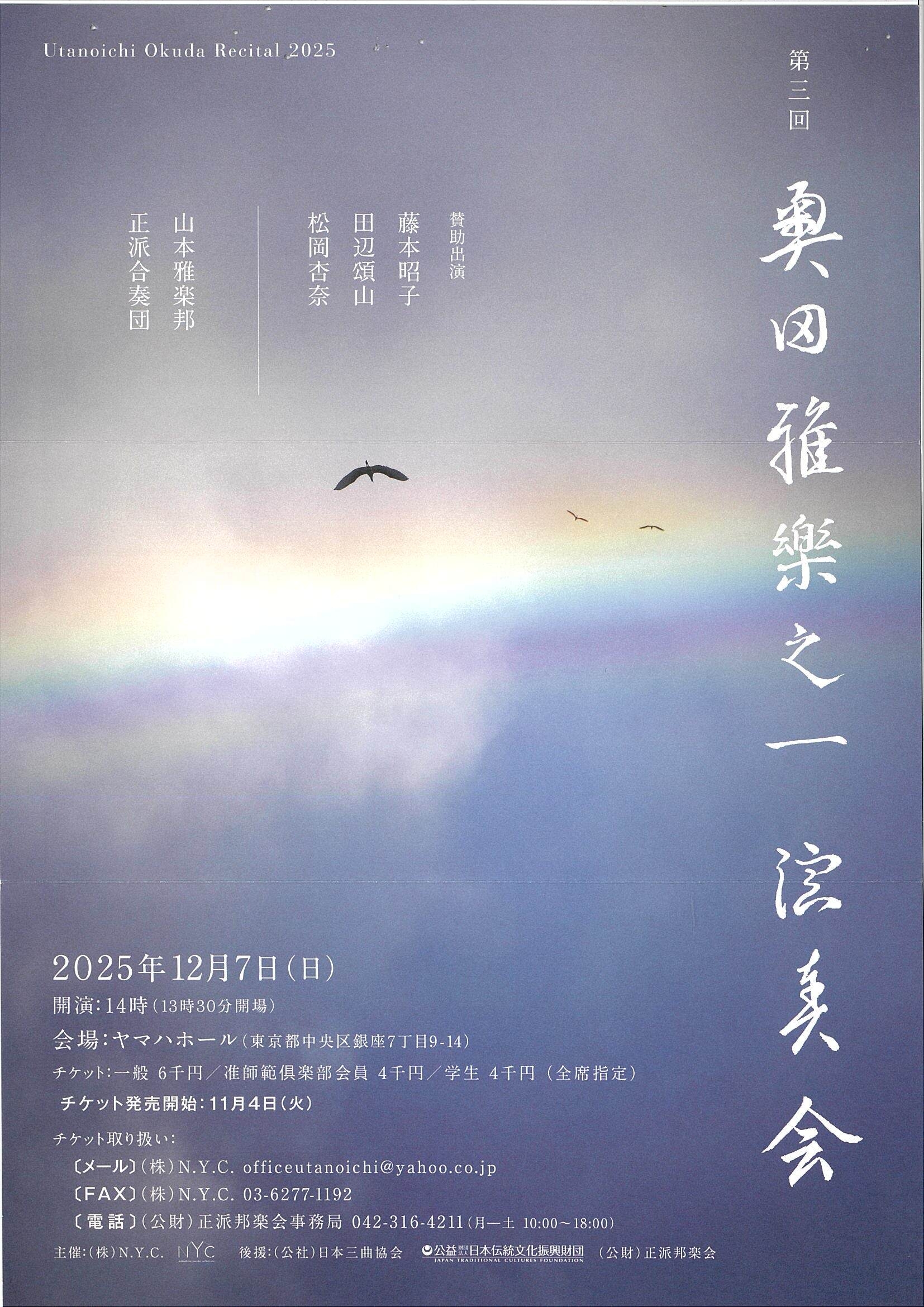 | 後援 | 公益社団法人 日本三曲協会 / 公益財団法人 日本伝統文化振興財団 |