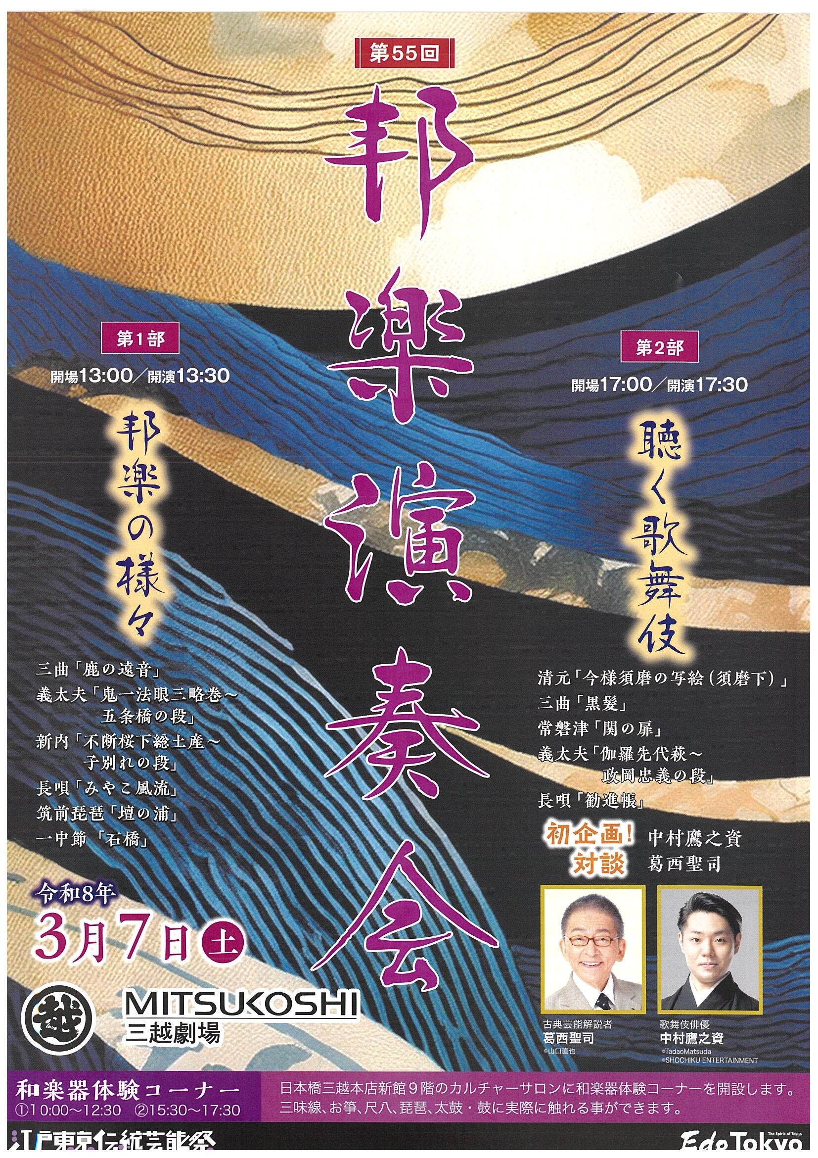 | 主催 | 邦楽実演家連絡会議/東京都/公益財団法人東京都歴史文化財団/江戸東京伝統芸能祭実行委員会 |