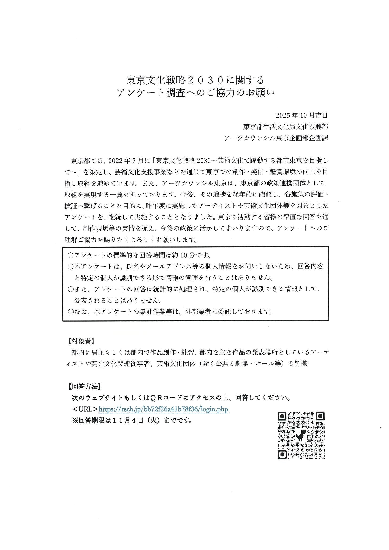 東京都・アーツカウンシル東京から、アーティストや芸術文化団体等を対象としたアンケートを実施いたしますので、